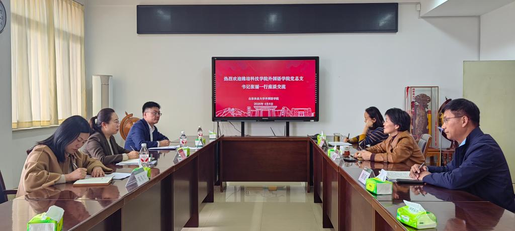为加快推进学科建设与硕士点申报工作,4月8日,外国语学院党总支书记张丽、副院长卢恩波、教学科主任陈伟红一行赴山东农业大学外国语学院开展专题调研。山东农业大学外国语学院院长李伟、副院长徐启豪及相关负责人热情接待并出席了座谈。