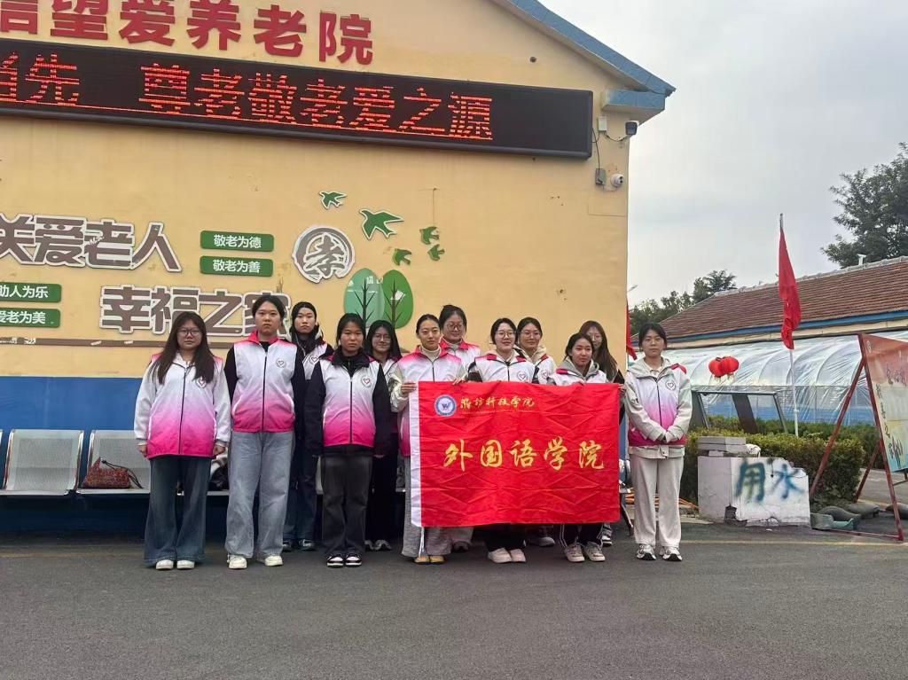 为弘扬中华民族尊老敬老的传统美德,搭建青年群体与老年群体的情感沟通桥梁,10月 23日,外国语学院梦马青年志愿者服务队前往寿光市信望爱养老院,开展“情暖夕阳红,青春伴我行”主题志愿服务活动。此次活动不仅为养老院的老人们送去关爱与温暖,更助力大学生在实践中深化社会责任认知,以实际行动践行“外语 +”一站式学生社区综合育人模式,展现新时代青年的温情与担当。
