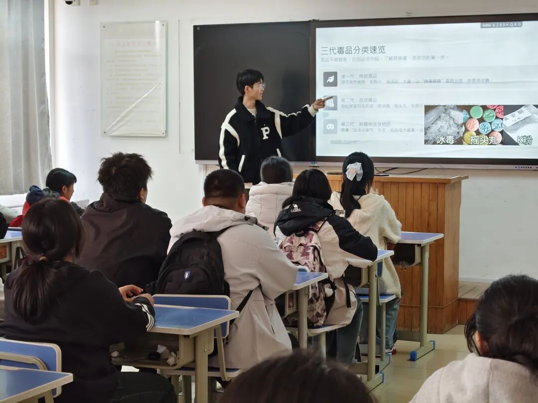 活动伊始,主讲人首先结合真实案例,点明了禁毒教育的严峻意义与本次活动目的。随后,宣讲围绕“毒品真面目”“毒祸深渊”“识毒辨形”“拒毒有方”“守护未来”五大板块层层展开。通过剖析“笑气”“伪装电子烟油”等鲜活案例,配合直观的图文展示,系统讲解了毒品的定义、危害及防毒“六不”守则,指导学生精准识破毒品伪装,掌握关键拒毒技巧。为深化认知,活动还组织了《湄公河行动》缉毒片段的观影环节,以极具冲击力的影像让学生切身感受到禁毒斗争的紧迫性与艰巨性。整场活动内容充实、环环相扣,有效营造了全校关注禁毒的良好氛围,为构建无毒校园奠定了坚实基础。