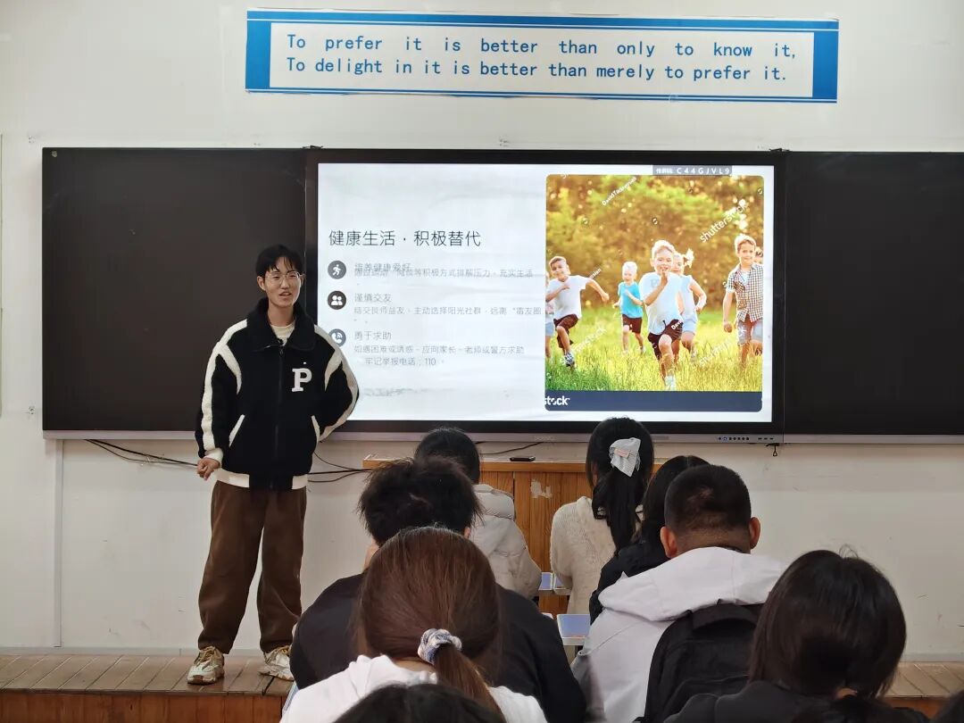 为切实增强青年学生的禁毒防毒意识,10月21日,外国语学院举办“珍爱生命,筑牢禁毒防线”主题教育活动,得到全院学生积极响应。活动围绕“拒绝毒品,守护美好人生”主题PPT展开,通过系统讲解毒品知识与播放警示影片相结合的方式,引导学生深刻认识毒品危害,切实增强拒毒能力,实现了“知识入脑、情感入心”的双重教育效果。