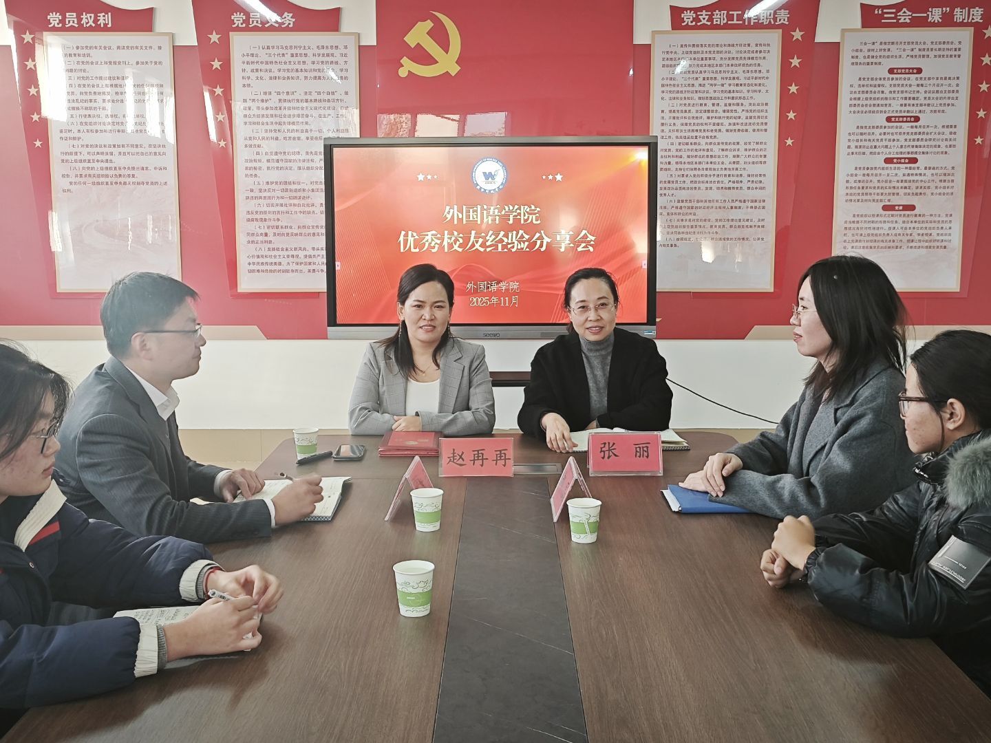 为拓展学生职业发展视野,激发创新创业意识,11月27日,外国语学院在301会议室举办“职引未来·薪火相传”优秀校友经验分享座谈会。本次活动特别邀请2006届优秀校友、外贸领域资深从业者赵再再返校,以“走近外贸”为题,分享其深耕行业的实战经验与成长心路。学院党总支书记张丽、副书记郝磊、副院长卢恩波及教师代表、辅导员与学生代表共同参会。