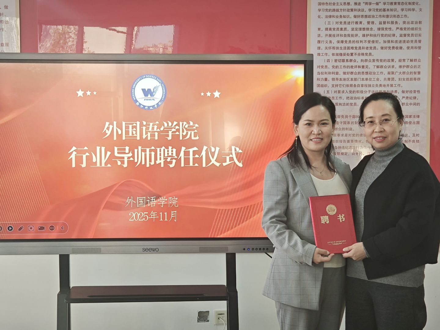 互动环节气氛热烈,师生就外语专业外贸发展路径、课程与实务匹配度等问题深入交流。郝磊副书记总结时表示,赵再再的分享兼具实操性与启发性,为学生职业规划提供了鲜活指引。会上,张丽书记为赵再再颁发行业导师聘书,她表示,聘任优秀校友担任行业导师,是学院深化产教融合、强化实践育人的一项重要举措。她强调,这份聘书承载着荣誉,更寄托着责任与期望,期待赵再再校友以其卓越的行业洞察与实践经验反哺母校,为外语学子的职业规划与成长路径精准赋能。